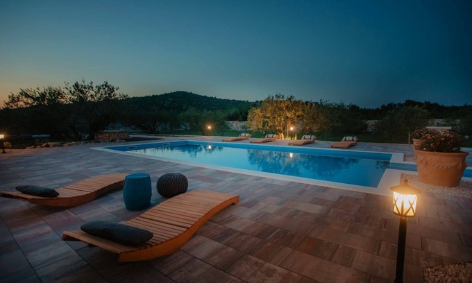 Best-rates for the Vodice villa starts from $1,049 per night with includes Guest Services, Barbecue/Outdoor Cooking, Private Pool, Balcony/Terrace, Bedding/Linens, Fireplace/Heating, Child Friendly, Parking, Pool, Sports/Activities, TV, Security/Safety, Wellness Facilities, Toiletries, Internet, Kitchen, Laundry, Air Conditioner with all other amenities. Perfect for Weddings is committed to ensuring every guest experiences a comfortable and extraordinary stay, whether planning a romantic getaway, a honeymoon, a pet-friendly stay, or celebrating with the entire wedding party.