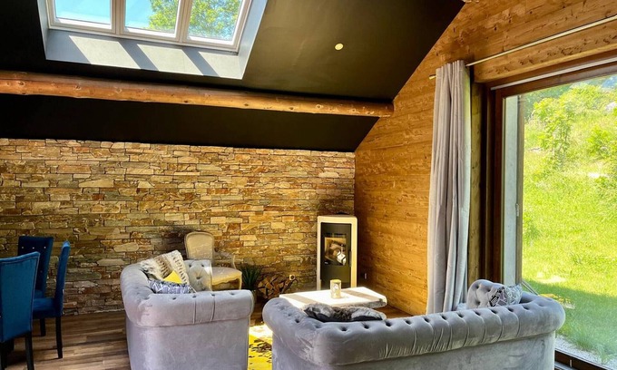 Comfortable and cozy, it offers a beautiful living room of 45 m², opening onto a large terrace to the South and very bright thanks to its skylights. It has a very well-equipped kitchen, a dining area and a living room with a wood stove ensuring cozy and warm comfort for its occupants.