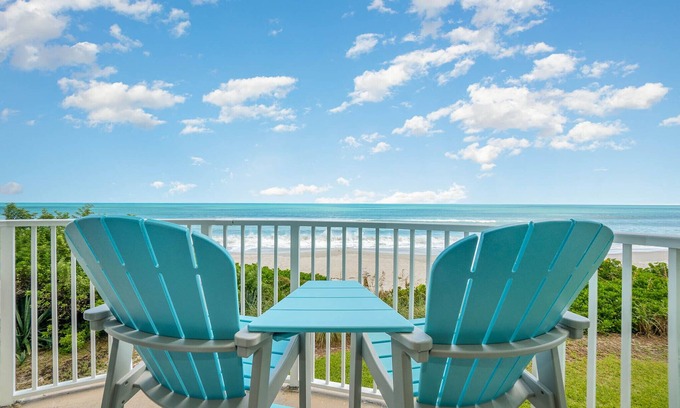Beautiful sunrises from your private direct, oceanfront balcony! Sip your morning coffee or evening cocktail while watching dolphins frolic in the waves, sea turtles nesting, or even rocket launches. Welcome to Villa Riviera! Renovated 2 story 2 bed 2 bath condo accommodates up to 6. Ideal for couple, family or close friends. Master bedroom has king bed, guest bedroom has 2 full beds. Private beach and heated pool for your sun-soaking and cooling off pleasure. Don't forget your fishing pole! Shopping and restaurant-friendly area. *New listing discount (first 3 listings)* **Weekly discounts. Reduced rates mid Aug thru Oct!**