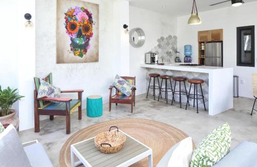 Villa Robalo Penthouse - Villas del Palmar offers accommodations in Sayulita, a 2-minute walk from Sayulita Beach and 20 miles from Aquaventuras Park. This beachfront property offers access to a terrace, free private parking, and free Wifi. The air-conditioned vacation home consists of 1 bedroom, a living room, a fully equipped kitchen with a dishwasher and a coffee machine, and 1 bathroom with a shower and a hair dryer. Guests can take in the views of the sea from the balcony, which also has outdoor furniture. The vacation home offers bed linen, towels, and daily room service. Guests can enjoy the outdoor swimming pool and garden at the vacation home. Puerto Vallarta International Convention Center is 23 miles from Villa Robalo Penthouse - Villas del Palmar. Lic. Gustavo Diaz Ordaz Airport is 22 miles away.