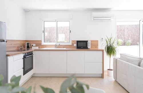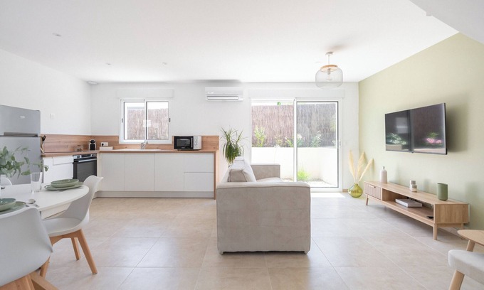 - Air-Conditioned Living Room and Kitchen: A spacious, bright living area with generous openings, and a modern kitchen opening onto a sunny covered terrace, perfect for relaxation and convivial moments.