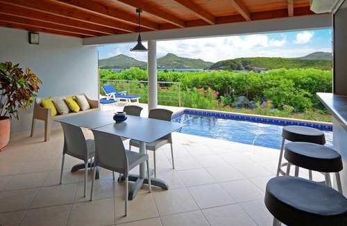 Nestled among lush vegetation, this Caribbean vacation villa is the perfect place for romantic getaways and honeymooners. Offering panoramic views of the Caribbean Sea , this vacation villa is set in the most comfortable and serene of settings. Tranquility and peace makes this beachfront vacation villa on the Caribbean Sea an ideal 'get away' vacation place. A week at this St. Barth villa can provide peace and relaxation for any vacationer.