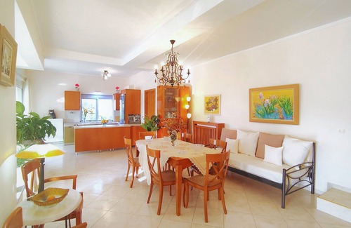 On the outskirts of the city of Chania, this spacious 126m2 villa with 2 bedrooms and swimming pool, ideal for up to 4 people, is set in a private property with orange groves. Located on the road that connects Chania with the Sougia coast to the south and the Omalos mountains and the Samaria gorge, it is ideally located for visiting the city center and all the sights of the region, from the beautiful beaches to the picturesque Cretan countryside. Only 11 km and less than 15 minutes by car from the town centre, 10 minutes by car from the nearest sandy beaches on the north coast and 5 minutes by car from the leisure water park. In the village of Agia, in the Episkopi area, the fully equipped villa offers convenient, comfortable and private accommodation. Grossery and cafe just across the street. Agia is a rural area where the landscape is characterized by the cultivation of citrus fruits and olive trees. The landmark of the region is the protected habitat of Lake Agia, which is an ideal recreation area for hiking. The villa consists of two double bedrooms, large dining and living areas, a large covered outdoor veranda, beautifully landscaped flower gardens, a private swimming pool of 35 m². surrounded by a large terrace with deckchairs and parasols, private indoor parking. The master bedroom has a queen size double bed and the second has a double bed.Both bedrooms have air conditioning, plenty of storage and balconies overlooking the orange grove. In the open dining room there is a sofa (1.00m x 2.00m) which can be used as a bed. Through the fully equipped kitchen is provided access to a covered veranda with table and chairs. From there, an outside staircase leads to the swimming pool. A charcoal barbecue is provided. The villa is fully cleaned and beds made before guests arrive. All towels (double set for each) and linens are included and will be replenished weekly. The popular and fairly busy coastline of Platanias and Agia Marina is easily accessible from the villa, just a ten minute drive away. There you can enjoy the organized sandy beach and the Cretan sun. In general, it is a suitable base for people wishing to explore the delights of western Crete. An ideal place to have exclusive use, privacy and at the same time easy access to all activities. For your best service, a rental car is recommended.