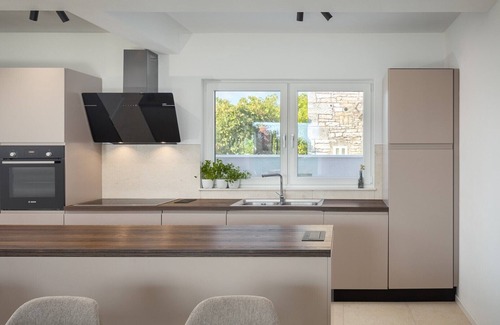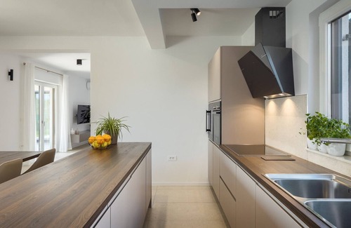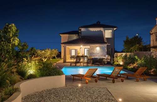 Villa Rozhica is a new, beautiful and modern luxury villa with a private pool and whirlpool suitable for 8 people. It is equipped with high-quality designer furniture. On the ground floor of the house there is a spacious living room with a view of the large swimming pool (49 m2), a beautifully landscaped garden and green surroundings. A fully equipped kitchen with a dining room and one en suite bedroom with its own bathroom, which is specially equipped and suitable for people with disabilities, is located on the ground floor of the house. On the second floor there are three bedrooms with their own bathrooms and a balcony. The house is fully air-conditioned and offers parking for 3 cars. If you are planning a relaxing vacation with your family or friends, in a secluded location, this is the right place for you. Pets and party groups of younger people are not allowed.