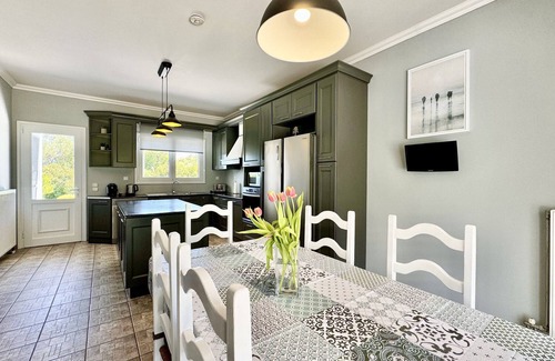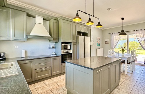 Inside, the property is set over 2 floors and has been modernly finished and designed, in order to provided high comfort and all the most modern amenities. On the ground floor there is a huge lounge with adjoining kitchen and dining area. The lounge has comfortable sofas, satellite TV, high speed wi-fi internet connection. The fully equipped kitchen has all the essentials for a self catering holiday as well as big patio doors opening straight to the barbecue area outside. On the ground floor there is also a double bedroom, a WC, and a useful laundry room with washing machine and dryer. Stairs lead up to the upper floor with 4 bedrooms (3 doubles, one with twin beds that can be joined on request to form a double), a family bathroom and another impressive family bathroom with both bathtub and shower. For the comfort of our guests, cleanings, change of towels twice a week and change of linen once a week are included in the rental price.