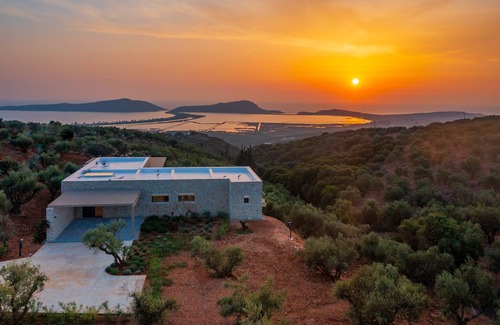 The villa is located on the top of the hill above the Bay of Navarino, with breathtaking views of the Ionian Sea and the Gialova Lagoon, beyond its own infinity pool. This remarkable residence spans two levels, featuring 4 bedrooms with ensuite bathrooms and a private gym area, while it is seamlessly integrated into an olive grove.