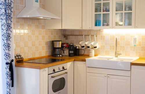 Upstairs, you’ll find two charming bedrooms, both with air conditioning and a lovely sea view. A modern bathroom with a shower is also on the upper floor, and all bedding and towels are provided.