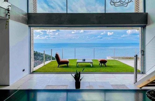 Floating stairs lead up to the 2 delightful bedrooms that feature beautiful en suite bathrooms and floor-to-ceiling windows so you can lie back and feel you are floating between sky and sea. There are 4,000 metres of outside space to enjoy and a gorgeous infinity pool (13 x 3), framed by oversized loungers and shady parasols that faces out to sea. The gardens are surrounded by olive groves and you really are in your own private oasis at Villa Sage!