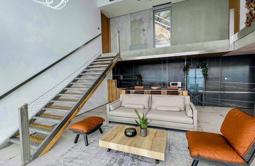 The living and dining space has been carefully designed to be airy and bright with double-height windows flooding the space with light. The seating area faces out to the glass-framed furnished terrace, seamlessly drawing in stunning outside scenery and the modern well equipped kitchen/diner is a lovely space for tasty treats and lively mealtimes.