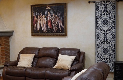 Nestled in the beautiful Tuscan Hills, with spectacular views of the Tuscan countryside, and with a large olive grove on the premises, this apartment includes 2 bedrooms, 2 living rooms, 1 fully equipped kitchen, and 1 bathroom with a bidet and a walk in shower. The two bedrooms have a king size bed and two twin beds, respectively, and one of the living rooms has two sofa beds for 4 people. The apartment can comfortably accommodate up to 8 people. In addition to this, there is an outdoor sitting and dining area.