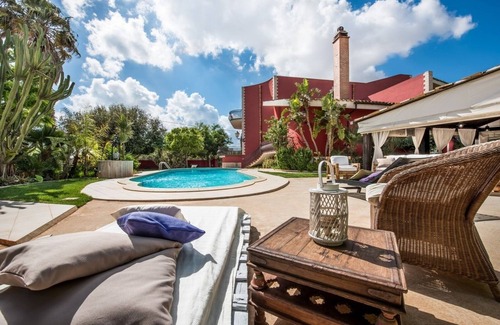 Villa Samantha is a is a luxury vacation rentals in Sicily with private pool. The villa is luxury furnished, very close to the beach, just less than 1 km. Mazara del Vallo, villa Samantha, is in a strategic position just 1 hour from Palermo and and a few minutes form other famous destination in this area. This luxury villa has a lovely garden, a 12 meter sswimming pool with comfortable solarium and outside kitchen with barbecue, where you can spend relaxing days. Villa Samantha is the ideal luxury location for spending your holiday in Sicily. Details This Vacation villa rental has 2 floors. Ground floor: living room and kitchen with a big stonefireplace 1 luxury bathroom with Jacuzzi tube and Jacuzzi shower laundry with big washing machine very large further living room First Floor 3 double bedrooms 1 twin bedroom 1 bathroom with tube Outside elegant and well equipped kitchen with barbecue and living table 2 solarium areas around the pool fornished with sunloungers and umbrellas swimming pool 12 mt ornamental garden orchard