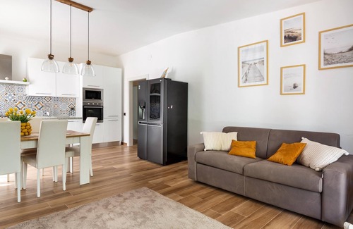 Villa San Donato opens into a large living room with modern open kitchen. The living room is furnished with dining table, double sofa bed and a tv.
