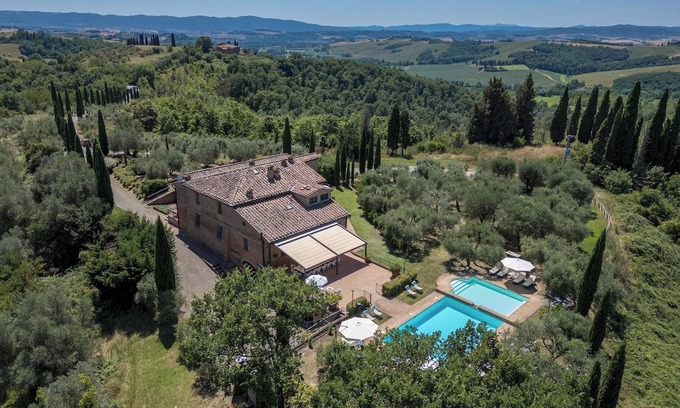 South of Siena, just 4 km from the historic village of Buonconvento, Villa San Nazario is set in the stunning landscapes of Val d’Orcia and the Crete Senesi. Elegant and Tuscan in style, it consists of two air-conditioned buildings with 9 suites, accommodating up to 20 guests. Ideal for families and active travelers, it offers plenty of outdoor activities. The main house features a spacious living room and a professional kitchen opening onto a panoramic terrace with pergola, overlooking Montalcino, and a large manicured lawn with two pools and a jacuzzi. Surrounded by nature, it's close to Siena (30 min) and the Abbey of Monte Oliveto Maggiore (5 min).