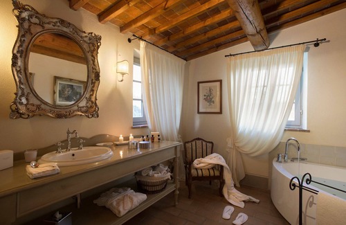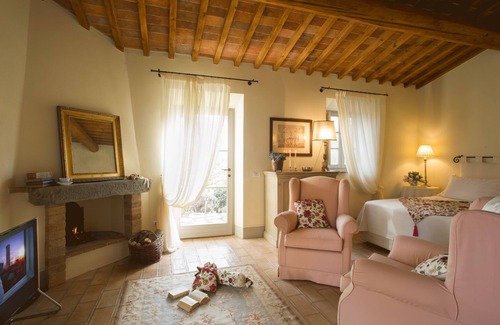 Villa San Sanino - Relais in Tuscany offers 4 accommodations with indoor private hot tubs and fireplaces. Rooms open to balconies or patios. Each accommodation is individually furnished and decorated. Memory foam beds feature premium bedding. A pillow menu is available. 43-inch Smart televisions come with premium satellite channels and Netflix. Bathrooms include separate bathtubs and showers with jetted bathtubs and rainfall showerheads. Bathrooms are also outfitted with bathrobes, slippers, and designer toiletries.