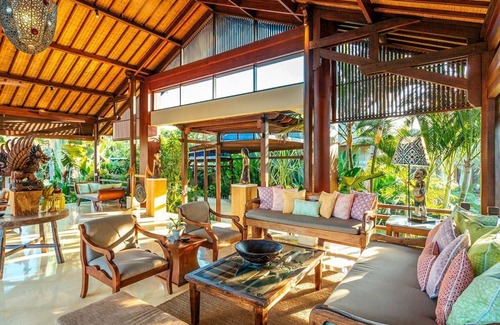 Overlooking an enchanting sea temple on top of a dramatic volcanic outcrop, this villa has superb ocean views and mesmerising sunsets. The villa is spread over vast gardens and features Balinese open plan pavilion living. A full team of staff are on hand to make your holiday a memorable one. Events for up to 80 guests can be held at this property.