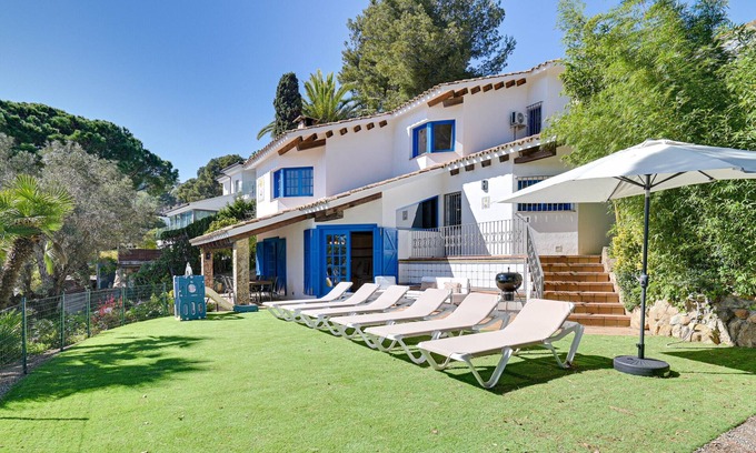 Nestled in the exclusive bay of Cala Sant Francesc, Blanes, Villa Serena offers the perfect Mediterranean escape, just a 4-minute walk from the beach! Simply cross the street, follow the stairway, and find yourself on one of the most beautiful beaches of the Costa Brava.GROUND FLOOR The ground floor features an open-plan living area with two cozy sitting areas, TV, and a charming fireplace.Direct access to the garden with sun loungers, a parasol, and a covered porch equipped with an outdoor dining table and BBQ—perfect for al fresco meals.Fully equipped kitchen, including a Dolce Gusto coffee machine.A separate dining area overlooking the living space.Courtesy toilet. Laundry room with a washing machine.FIRST FLOOR The villa has four comfortable double bedrooms:- Master bedroom with a double bed and an ensuite bathroom (with shower).- Second bedroom with a double bed.- Third bedroom with two single beds.- Fourth bedroom with two single beds.- A second bathroom in the hallway (with shower).All bedrooms, as well as the living and dining areas, have air conditioning (with heating for cooler seasons).PRIVATE CLUB ACCESS – Pool, Tennis & More!During your stay, enjoy free access to the private club in the bay, just a 2-minute walk from the villa. The club features a large swimming pool & children's pool, tennis court, bar and playground for kidsAdditionally, you’ll have a remote control for free parking in the gated open-air parking area right in front of the villa.BEACH & SURROUNDINGSThe stunning Cala Sant Francesc beach is just a 4-minute walk away, offering fine sand & crystal-clear waters, water activities, showers & lifeguard services. Make sure to visit the beachfront restaurant "Cala Bona" which offers excellent paella and seafood dishes.Other must-visit beaches nearby include Cala Santa Cristina, Cala Treumal, Cala Sa Boadella, and Cala Canyelles.Blanes town center is less than a 5-minute drive, where you'll enjoy its lively marina, scenic promenade, many boutique shops & fantastic restaurants.Inside the villa, you’ll find a welcome booklet with our personal recommendations and insider tips to make the most of your stay!ADDITIONAL INFORMATION- Free high-speed WiFi- One set of bath towels per person included- Official tourism registration number: HUTG-009609- Important: Unfortunately groups of young travelers are not allowed. The minimum age requirement is 28 years. Families with children/young adults are more than welcome!