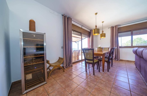 The living room is a cozy and elegant space, with sofas and armchairs that invite you to relax. With air conditioning and direct access to the pool area, this space also has a wine cellar and a multimedia entertainment center with television.