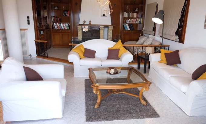 A 160 sqm apartment, fully renovated with a spacious living room with a piano, a dining room that can easily sit 8 people and a sitting room with a flat screen TV, a fireplace and two bookcases is appealing to families and groups of friends. The kitchen is quite modern with granite counters and all the necessary appliances (ceramic oven, fridge, dishwasher, microwave, coffee maker, electric kettle). The view to the sea from the balcony doors as well as the kitchen windows is absolutely breathtaking. You can spend moments of relaxation and peace just by staring at the sea. Another highlight at the house would be the converted loft which can sleep up to 5 people with its private bathroom. Needless to say that there is air-conditioning in the house and central heating for winter months.