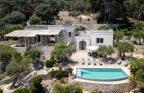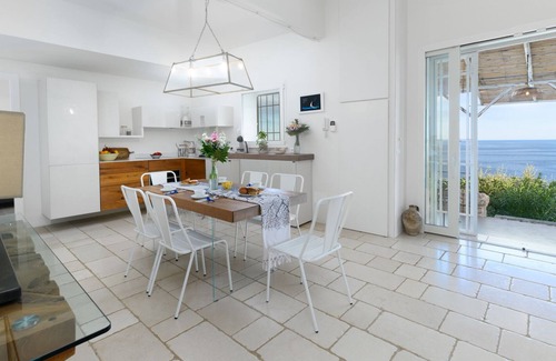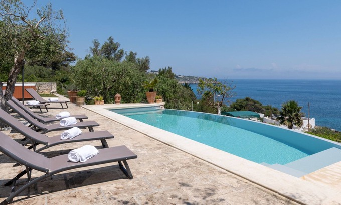 Villa Soleluna is a villa overlooking the sea near Castro Marina, along the Adriatic coast of Salento. Surrounded by a Mediterranean garden with olive and pine trees, it has a private pool, hot tub and panoramic sea view, in an ideal setting for relaxation. Covered in local stone, the villa consists of a main body and an annex. Renovated in a simple style with pastel tones and details inspired by the sea, it houses four bedrooms, two living areas and panoramic terraces. It is possible to dine inside in the spacious kitchen or outside on the terrace. Just 50 meters from the sea, the villa is perfectly located for exploring Otranto, Santa Cesarea Terme and Santa Maria di Leuca. Note: The telephone and internet signal may be limited due to the natural and confidential environment.