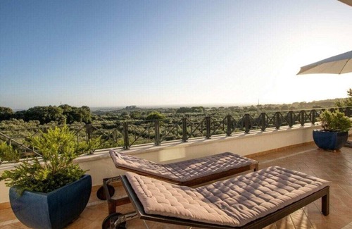 The holiday apartment "Melograno" (130m², including a 30m² roof terrace with sea view) is located in the private park of Villa Stauder, in the Castelli Romani area and close to Rome. It is located on a large estate with lawn, ornamental plants and olive groves. Swimming pool available (4.6 meters in diameter) The holiday apartment "Melograno", suitable for 4 - 5 people, is on the 1st floor of the holiday home, is spacious, sunny, quiet and has a large panoramic terrace with dining table, parasol and deck chairs for relaxing. Facilities: two bedrooms and a children's room, living room, kitchen-living room and 2 bathrooms. Enjoy the panoramic view of the surrounding olive groves, the nearby sea and in the evening while having dinner the sunset on the terrace.