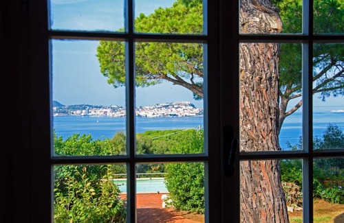 Outside the house we find a garden shaded by pine trees, an outdoor dining area and a swimming pool (3x6 metres) with a fantastic view of the gulf of Portoferraio.