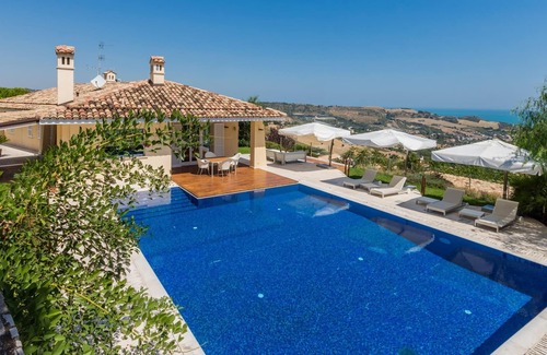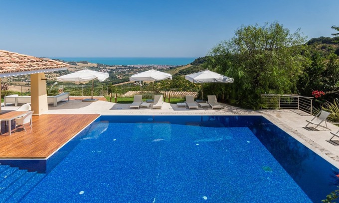 Villa Stella: stunning villa with sea views and wellness area in the south of Marche, just 10 minutes from the Adriatic sea.Villa Stella is a modern and elegant villa with pool near Acquaviva Picena, in the province of Ascoli Piceno, in the southern part of the Marche.This villa is located in a very panoramic position with a breathtaking view of the Adriatic Sea and of the surrounding hills with olive tree groves and vineyards.The beach of San Benedetto del Tronto is only 4 km from the villa, where you can find many chalets and restaurants overlooking the beautiful promenade lined by pine groves and palm trees.In the surrounding area it's possible to walk among the street of historic towns enclosed by medieval walls such as Acquaviva Picena, Ripatransone, Offida and Ascoli Piceno, admiring beautiful squares with churches and ancient buildings.This area is also renowned for the production of fine wines among which Rosso Piceno DOC, Rosso Piceno Superiore DOC and Falerio DOC, which you can taste at the local wineries.The villa is surrounded by a lovely garden with shrubs and Mediterranean plants.The large and elegant pool with Roman steps has a deep from 1,50 to 2,00 metres, covered with an intense blue mosaic and with a sun terrace equipped with sun loungers and sun umbrellas.A large porch is directly connected to the kitchen of the villa and is equipped with table and chairs, barbecue and counter top with sink to comfortably outdoor dining.Near the pool there is also a lovely porch with table and chairs and an area with sofa, ideal to relax in the garden and enjoy wonderful views of the sea.