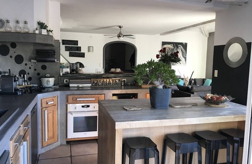 In this contemporary house you will benefit from a very large living room, dining room, a TV corner, an equipped kitchen open onto several terraces, one of which overlooks the swimming pool with jacuzzi !!! 3 bedrooms 2 bathrooms, a summer kitchen with barbecue. A contact zero six, / zero nine / forty-five / twenty-six / seventy-seven. Thank you