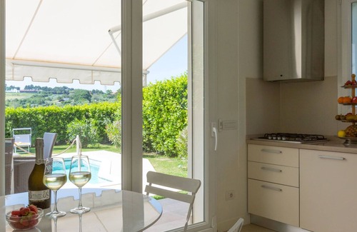 The private garden of the villa extends for about 2000 sq m. On entering the property you will be embraced by splendid olive trees which, illuminated at night, offer an unfogettable view over the Adriatic coast. The entrance area is completely covered in lawn, surrounded by unusual beds of oleander and laurel hedges, all well-maintained. In front of the kitchen exit is the dining area with a motorized awning and furnished with table and chairs. In the part facing the pool, the large sliding glass doors of the living room lead out to the beautiful gazebo with its cosy conversation area.Please notice that photos are taken in spring, therefore flower blossoming, and the colours of the gardens' grass could be different at the moment of your arrival at the villa.