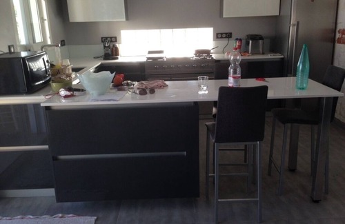 1 modern kitchen including a set of cupboards with 3 high chairs, 1 piano cooker / oven with hood, 1 micronde, 1 dishwasher, 1 Nespresso machine, 1 deep fryer, 1 kettle, 1 fridge, 1 set of crockery (cutlery pots, pans, casseroles, casseroles, pots, salad bowls, ...), 1 set of kitchen utensils ...