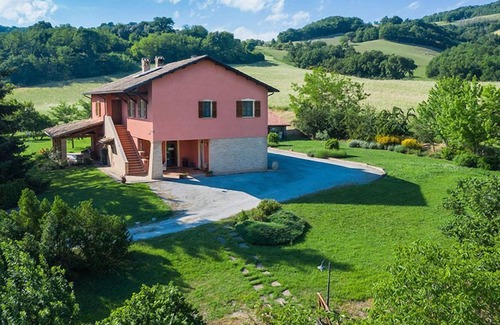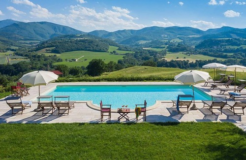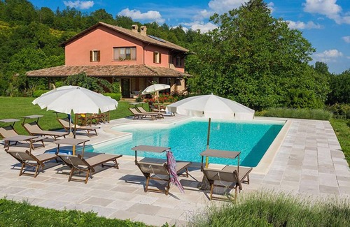 Villa Tea is a cozy private villa with swimming pool in Le Marche region. It is located just 2 km from the town center of Urbania, an ideal starting point for hiking or bike excursions and a famous center for the production of ceramic art. The villa is suitable for families or large groups who can enjoy their privacy thanks to the large interior spaces. The porch and swimming pool with Roman steps and whirlpool are the perfect shelter on hot summer days. Guests have access to a large panoramic garden and equipped outdoor areas.