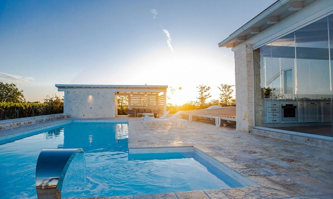 The glass patio with a view of the pool and terrace offer ideal spaces to enjoy the sun and starry evenings. Additionally, the possibility of organizing typical home-cooked dinners allows you to savor the delicious local cuisine without having to go out. This villa is an extraordinary choice for a luxury vacation in Puglia.