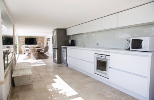 In front of the large pool, on the ground floor, there is a covered outdoor kitchen, equipped with fully opening windows, to ensure continuity with the garden. The kitchen is equipped with: sofa, tv, large refrigerator, oven, induction hob, dishwasher, utensils, worktops, coffee machine, electric kettle, and a bathroom with shower.
