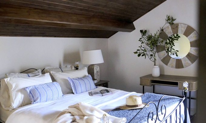 This is a self catering double suite with its own private bathroom with bathtub, smart Tv, mini refrigerator, coffee machine and kettle. The suite is located on the first floor of the Villa´s Grand House, and its windows open to the mountain and garden.