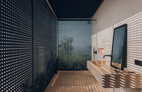Villa V sits on a sloped site, with the upper floor featuring the spacious master bedroom. Here, you also find the big pool, the kitchen/living room with its massive sunken sofa, and large open areas to relax. On the lower floor, you see the two bedrooms with studies and private bathrooms to give all guests privacy when needed.