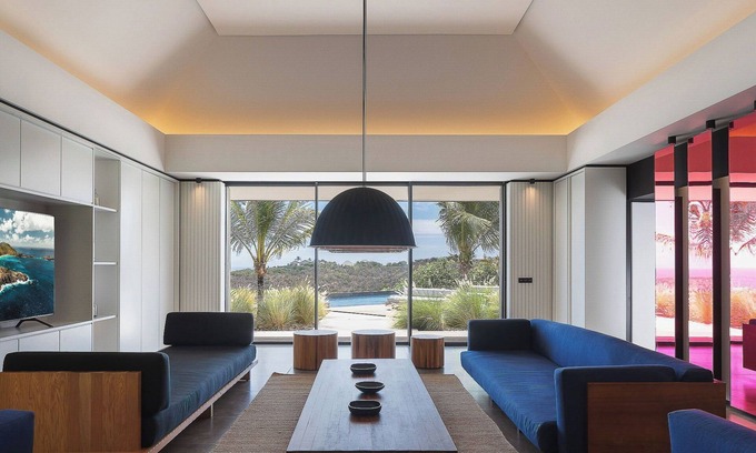 VALENTINA is a contemporary, modern and comfortable vacation home in the Caribbean. With large windows opening onto the terrace and the ocean, the air-conditioned and cozy living space features long benches with blue and wood hints under beautiful hanging lights. It offers three large comfortable and stylish sofas, just perfect for talking or watching a movie at night. The sophisticated decor is minimalist and perfect for entertainment. On the other side of the corridor is the dining area, furnished with an expansive round table that can accommodate up to ten guests: an ideal setting for very private dinners.