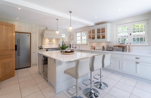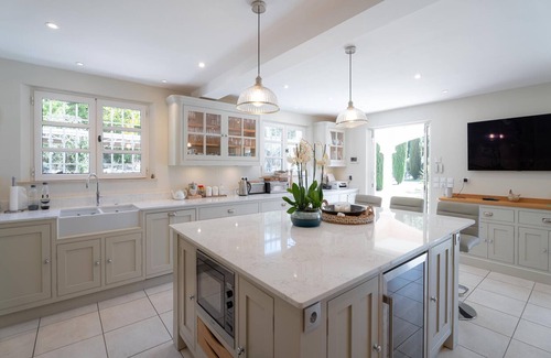 The ground floor opens to a large kitchen dining area, leading to the living room with fireplace and TV, There are 5 bedrooms with ensuite bathrooms: 1 on the ground floor and 3 on the garden level and a master suite on the first floor.