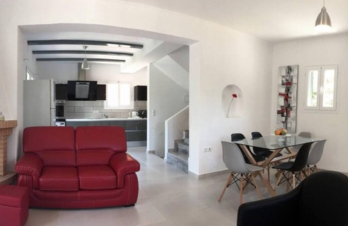 A three bedroom maisonette with 3 bathrooms (en suite), a fully equipped kitchen with dinning table and a spacious sitting room. It also features a washing machine, a dishwasher and a fireplace.The location is beautiful, relaxing and quite, at the heart of the island, close to the best sightseeings as well as the picturesque fishing port of Agia Efimia offering all amenities. You can relax in the 6people hot tub/Jacuzzi. There is also a BBQ to enjoy a special meal.