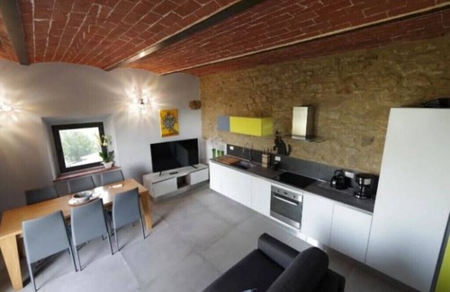 The accommodation has been converted from an old barn of a farmhouse in the Tuscan hills and has been renovated (2019) with particular attention to materials and tradition. The house has a private entrance and consists of two floors: the first floor overlooks the manor farmyard and consists of a bedroom with a comfortable double bed and a single bed, two wardrobes and a bathroom with a large shower and a window overlooking the hills. The stairs lead to the ground floor where the modern fully equipped kitchen is, equipped with an induction hob, kettle and coffee machine, the living room with a comfortable double sofa bed and a 55 "flat screen TV, the dining area with access to the external area. The exterior consists of a relaxation area, a large garden, a beautiful terrace with a dining area and a barbecue. There is also a laundry room with a washer and dryer. All outdoor areas have a splendid view of the Tuscan hills and neighboring countries. The premises are equipped with air conditioning, heating and mosquito nets. Private parking inside the property.
