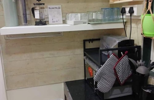 - A fully equipped modern functional kitchen with all basic essentials and electricals. The modern kitchen is eqipped with a refrigerator, microwave oven, an induction stove, a hot plate, toaster, tea/coffee pot and a modern latest hi-tech water filter. Also stashed with all cutlery, crockery, silver along with a full bar set with stock of whiskey, beer n wine glasses. Cheers !🥂