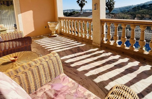 The inside of the villa:A soon as you enter, you find yourself in a very spacious hall from which you can go to the living-dining room or the kitchen.The living-dining room is a space on two levels, with marble floors and about 40 square meters.The entire room has panoramic windows from which you can contemplate the blue of the Mediterranean and the green of the mountains sitting on the comfortable 5 seater sofas.This area everything you need to bring your family together: a table and 6 chairs, a television and a strategically placed 5-seater sofa.All this framed in a landscape in which the pool is in the foreground.From the living room you access an outdoor covered terrace, with two very comfortable seats where you can rest outdoors and watch the sunsets with these magnificent views.Now it is the turn of one of the kitchens of the house (there are 3)It is fully equipped, including oven, microwave, dishwasher and a wine fridge.