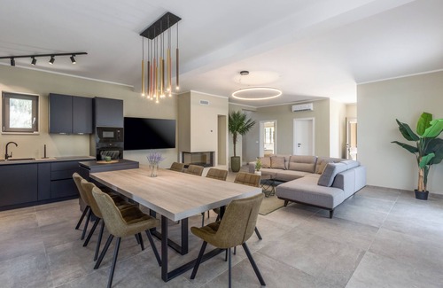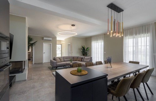 The villa consists of 4 bedrooms with bathrooms, and can host up to 8 people. The spacious kitchen and living room elegantly connect to the outdoor terrace where there is an outdoor dining table and grill.The pool is the center of all events in this villa. A beautiful large swimming pool surrounded by deckchairs and greenery offers all-day enjoyment.The territory of Buja stretches from the Mirna River to the Dragonja River, which also marks the border with the Republic of Slovenia. It is an undulating and hilly region covered with vineyards, olive groves and arable fields interspersed with oak, cherry and pine forests, a karst belt full of interesting geological phenomena and glades of Mediterranean vegetation, among which thyme and juniper stand out.