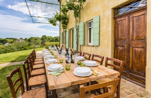 This magnificent villa, very great and with a wonderful panoramic view, is located in the Pesaro-Urbino province, in the northern part of the Marche region, only 10 minutes from the Adriatic Coast and from its beaches of very fine sand, such as Senigallia and Fano, with low depth perfect for children. It is immersed in a landscape rich in greenery, olive trees and vineyards of which the owners are passionate farmers.