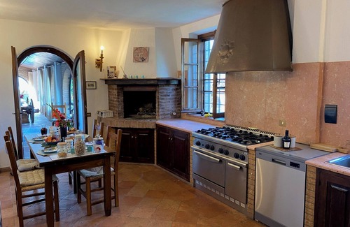 Set upon the lush hilltops of Lake Trasimeno surrounded by centuries old olive groves overlooking one of Umbria's best kept secrets, Monte del Lago. Only half an hour away from Tuscany. When you arrive you'll feel an immediate sense of serenity as you unpack yourself into a rustic, idyllic country house. The villa hosts 12 people, has 7 bedrooms, 6 bathrooms, fitness room, summer house, 2 kitchens, laundry room, large pool, game room, and a mill where we make our own oilve oil for you!