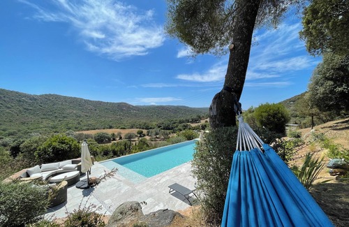 The house stands on a large, wooded plot of 10°500°m2. The park-like terrain near the hamlet of Conti is exceptional, dotted with impressive granite cliffs characteristic of southern Corsica.