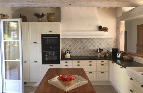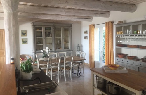 Large house in rural surroundings with large heated pool and fantastic outdoor kitchen with pizza oven and grill. Surrounded by picturesque Provencal villages with good restaurants and local markets, everything is right for a wonderful stay and opportunities to explore the best of Provence. The residence is located about 2 km from the center of Malemort du Comtat where you will find shop, bakery, restaurant and bar. Within a radius of 10 km you will find several villages with different offers and to Carpentras with 30 000 inhabitants it is 14 km and to Avignon 36 km.