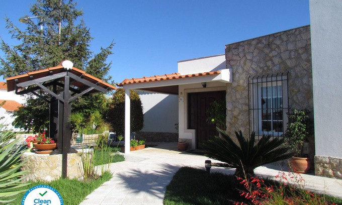 The villa is situated in a small village, very quiet, surrounded by beautiful beaches, close to Sesimbra. This villa is classified as accommodation and has saltwater pool with a garden nicely decorated. This charming villa has access and is equipped for people with reduced mobility (wheelchair). Easy parking right outside the house. The barbecue area is integrated with the pool terrace, making it a natural and perfect for an amusing barbecue. The interior comprises a charming living / dining room with fireplace, television with cable TV, CD player, DVD player, wifi internet and direct access to the pool area. A spacious living room and a fully equipped kitchen, 3 bedrooms with double beds and single and two full bathrooms, one with shower and one with a corner bath with easy access. Throughout the interior, mobility wheelchair is total. The doors are wide and there are no steps. This accommodation allows 6 people in total comfort. For 2 more people there is a sofa bed or an extra bed can be provided. Bed linen and towels are already in place, being exchanged for stays longer than 8 days. Half through your stay (more than 8 days), the cleaning of the house, the pool and garden, will be done.