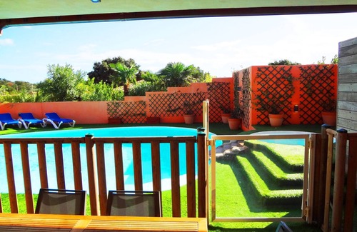 Living room, dining room, kitchen and bedroom overlooking the swimming pool. Ideal families.