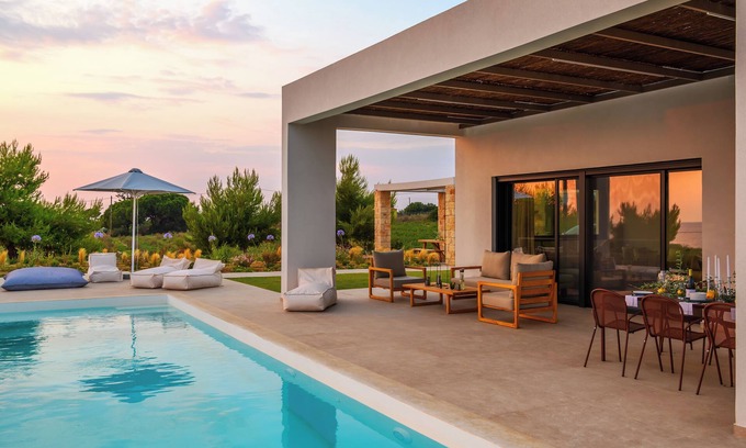 The large terrace of Nobus Villas - 1 has a dining area, a living room as well as sunbeds - poufs to enjoy the amazing sunset, next to the pool, gazing at the Ionian sea.