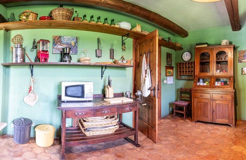 La cucina in stile vintage completamente attrezzata con: lavandino in pietra lavorato a mano, frigorifero, microonde, tostapane, lavastoviglie, forno, piano cottura, macchina del caffè, macchina per i pop-corn, tritacarne artigianale e completa di tutti gli utensili per mangiare. Collegata anche all'esterno grazie a una grande porta/finestra.