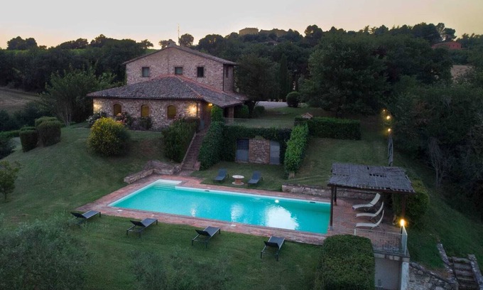 La villa, che si estende per quasi 500 mq su due piani, può ospitare fino a 14 persone, rendendola perfetta per grandi famiglie e gruppi di amici. Circondata da 1,5 ettari di giardino privato e prati, Casale Santa Maria è il luogo ideale per trascorrere vacanze divertenti e in piena tranquillità. La proprietà dispone di una splendida piscina con acqua salata (13x6m) che offre una vista mozzafiato sulle colline umbre, ed è circondata da prati e ulivi.